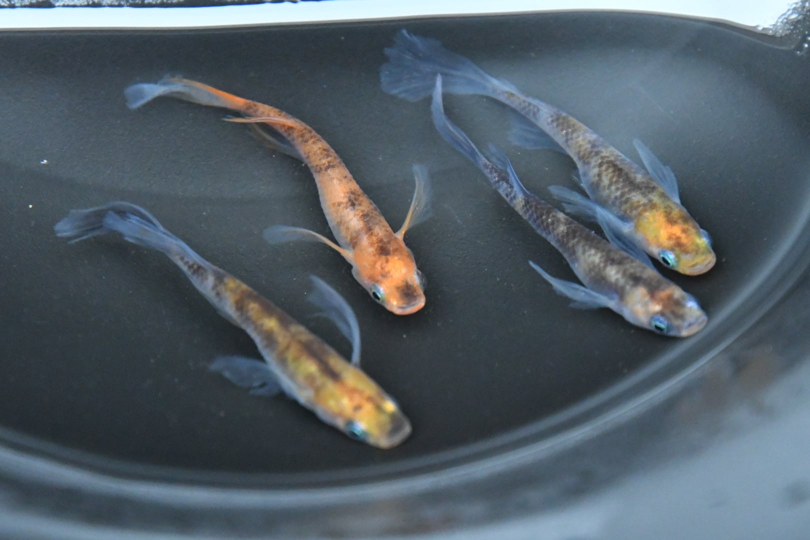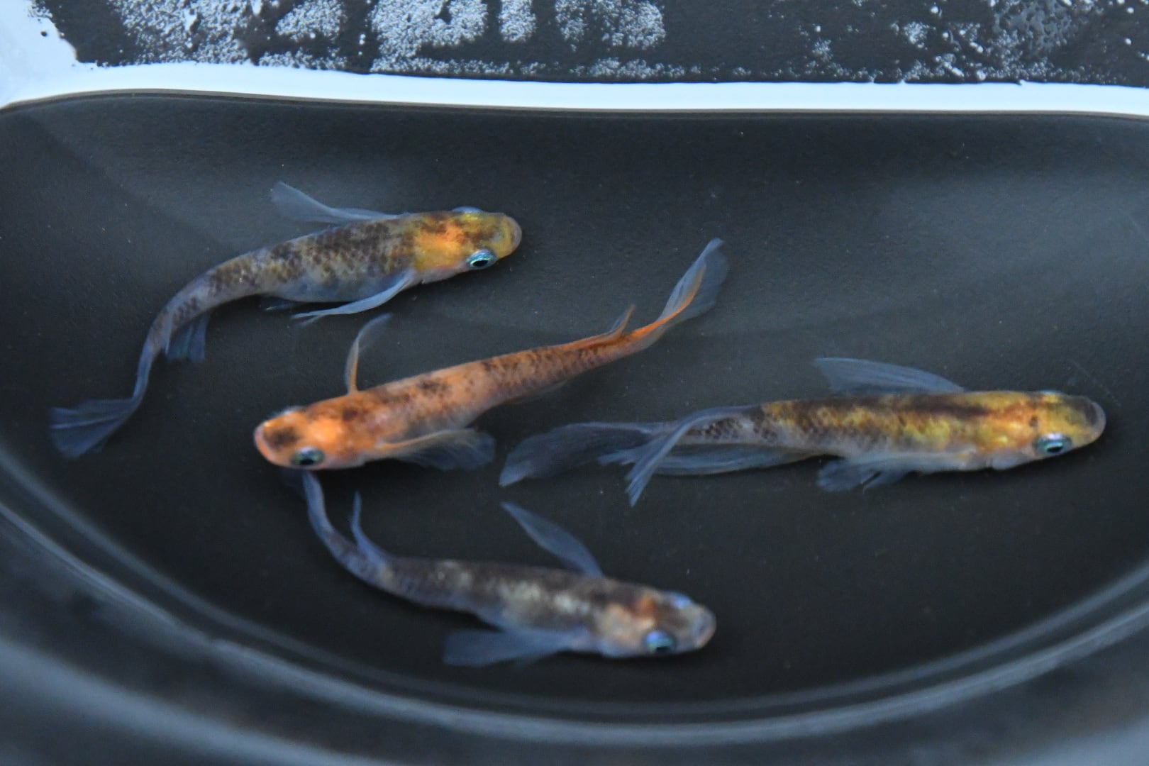 メダカが届いたら、ビニール袋に輪ゴムの封をしたままの状態で、容器または水槽の上に浮かべてください。