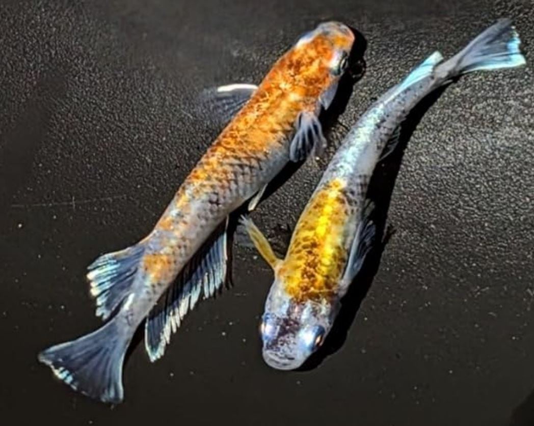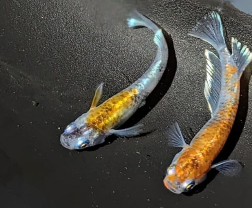 三色エメフィンキッシング 親個体写真の若魚1ベア2匹になります。 野外飼育です。当社は養殖場を運営しております。 【 三色エメフィンキッシング若魚1ベア2匹 】 をお送りいたします。